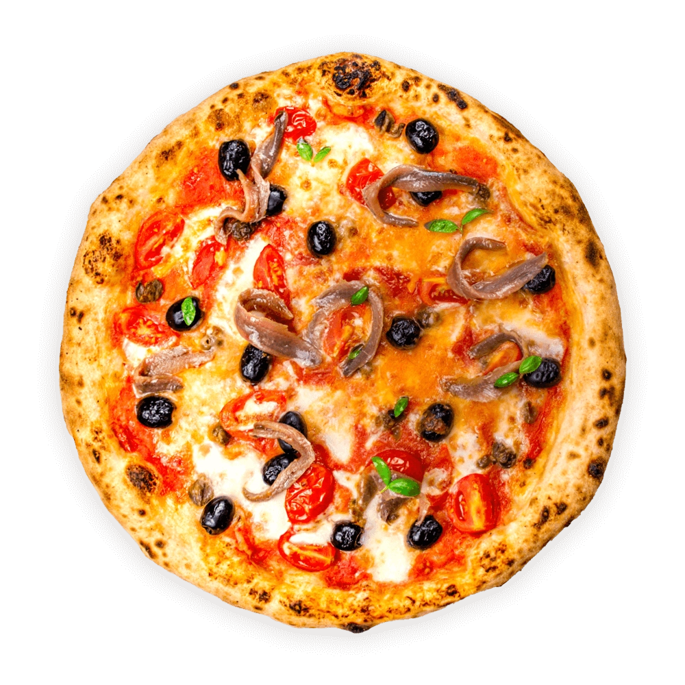 salsa di pomodoro, mozzarella fior di latte, capperi di Pantelleria IGP, acciughe del Cantabrico, olive nere e pomodorini fresch